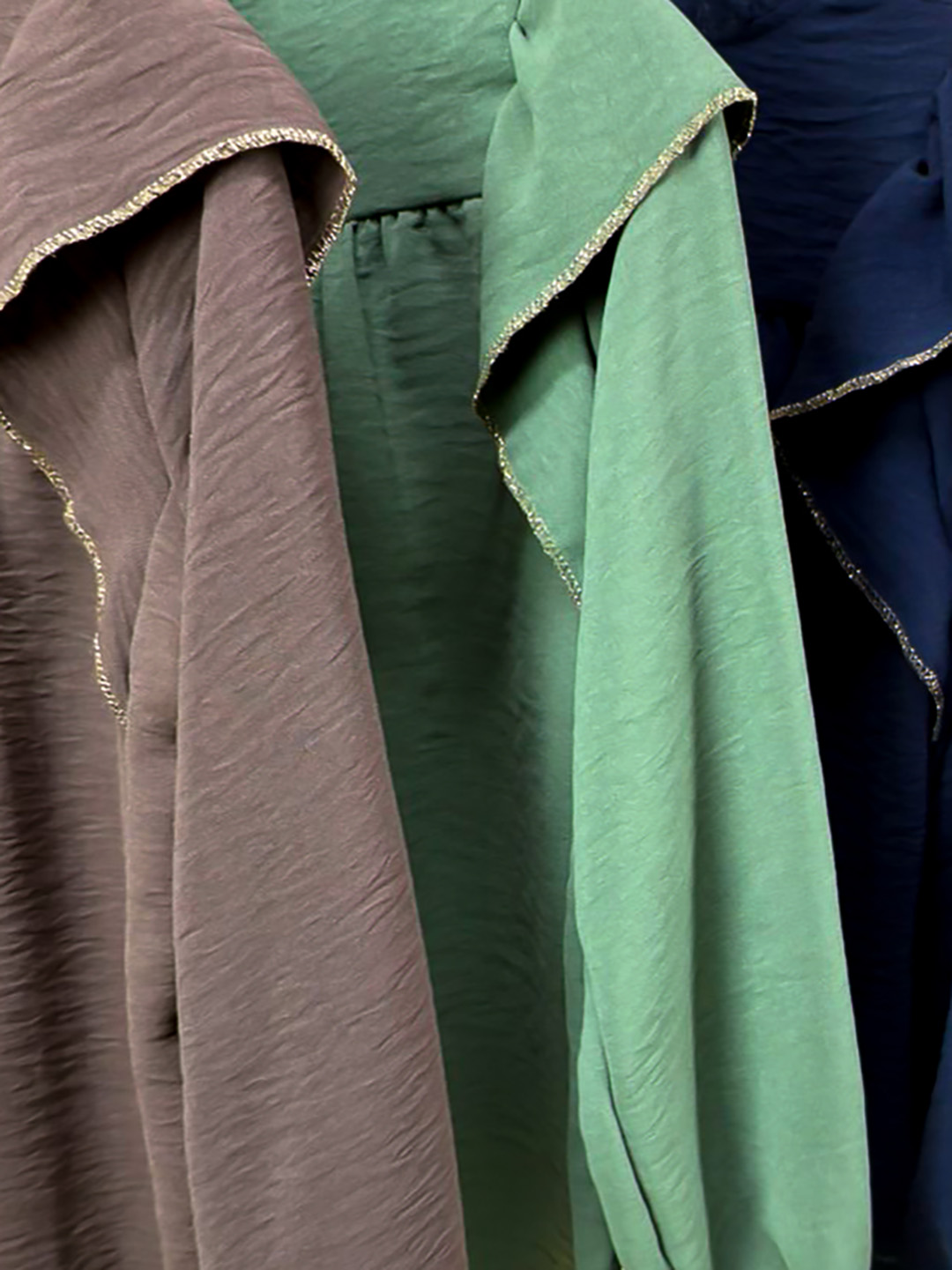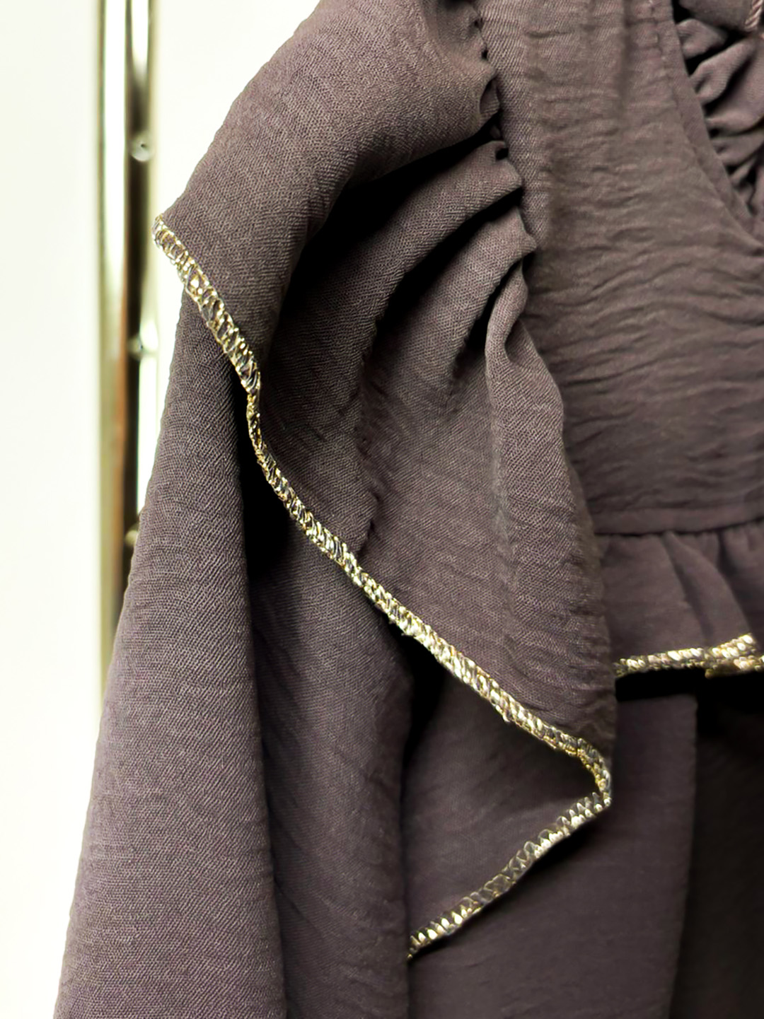 Top Coton Polyester ( 100%) col et manche volenté, bouton col en forme de cœur nacrée, volent sur le torse et le dos avec léger liseret doré, manche longue