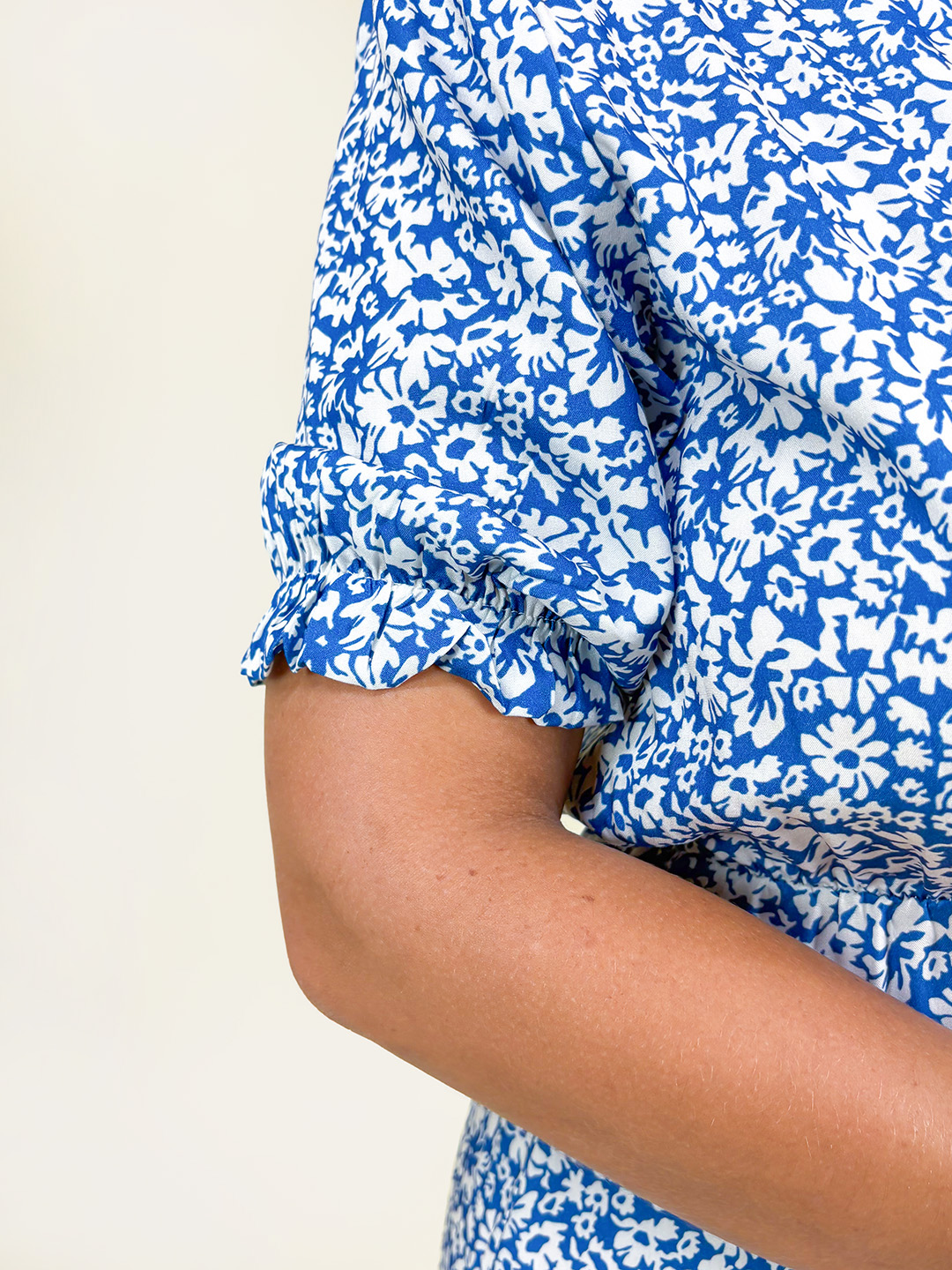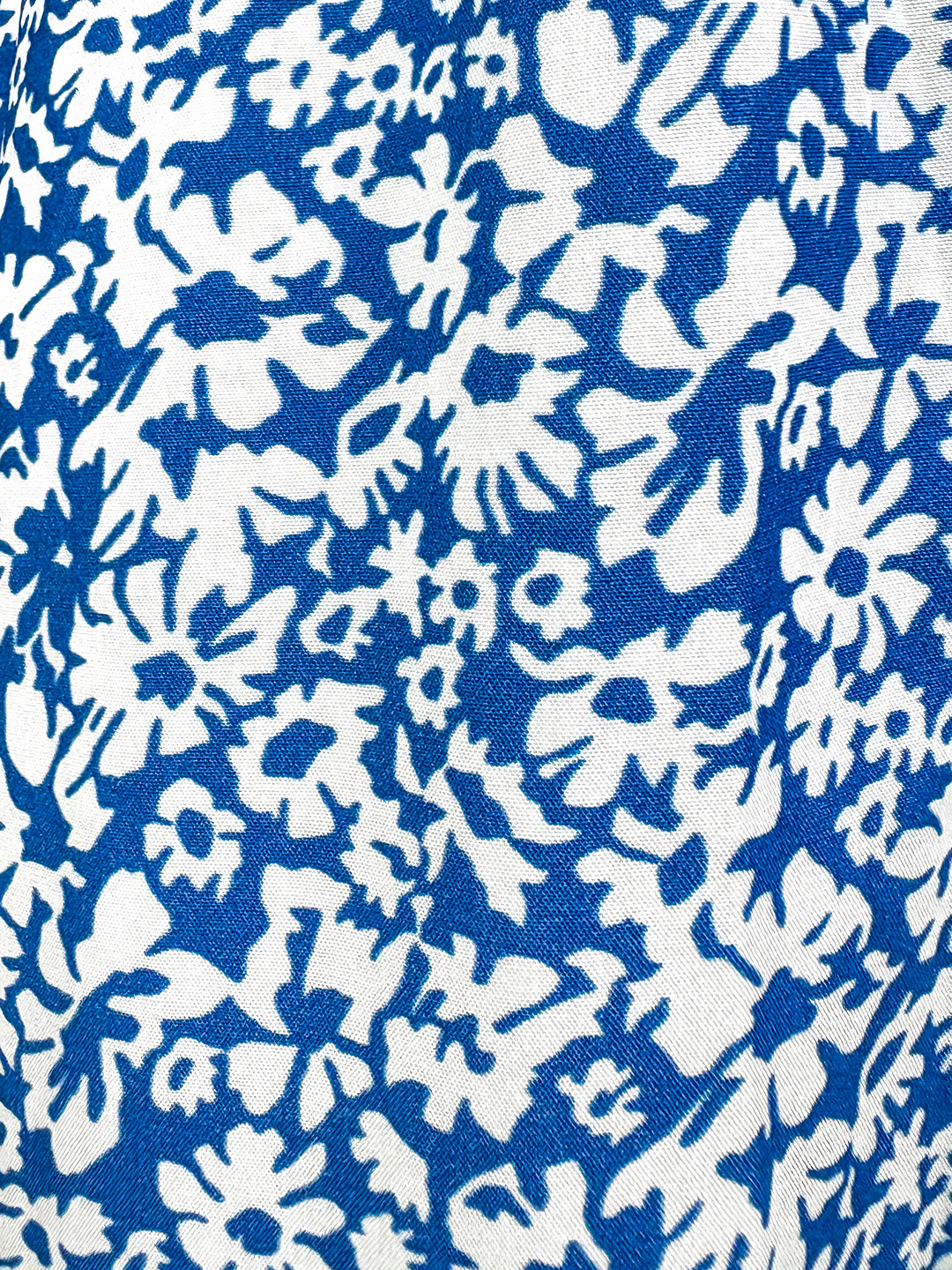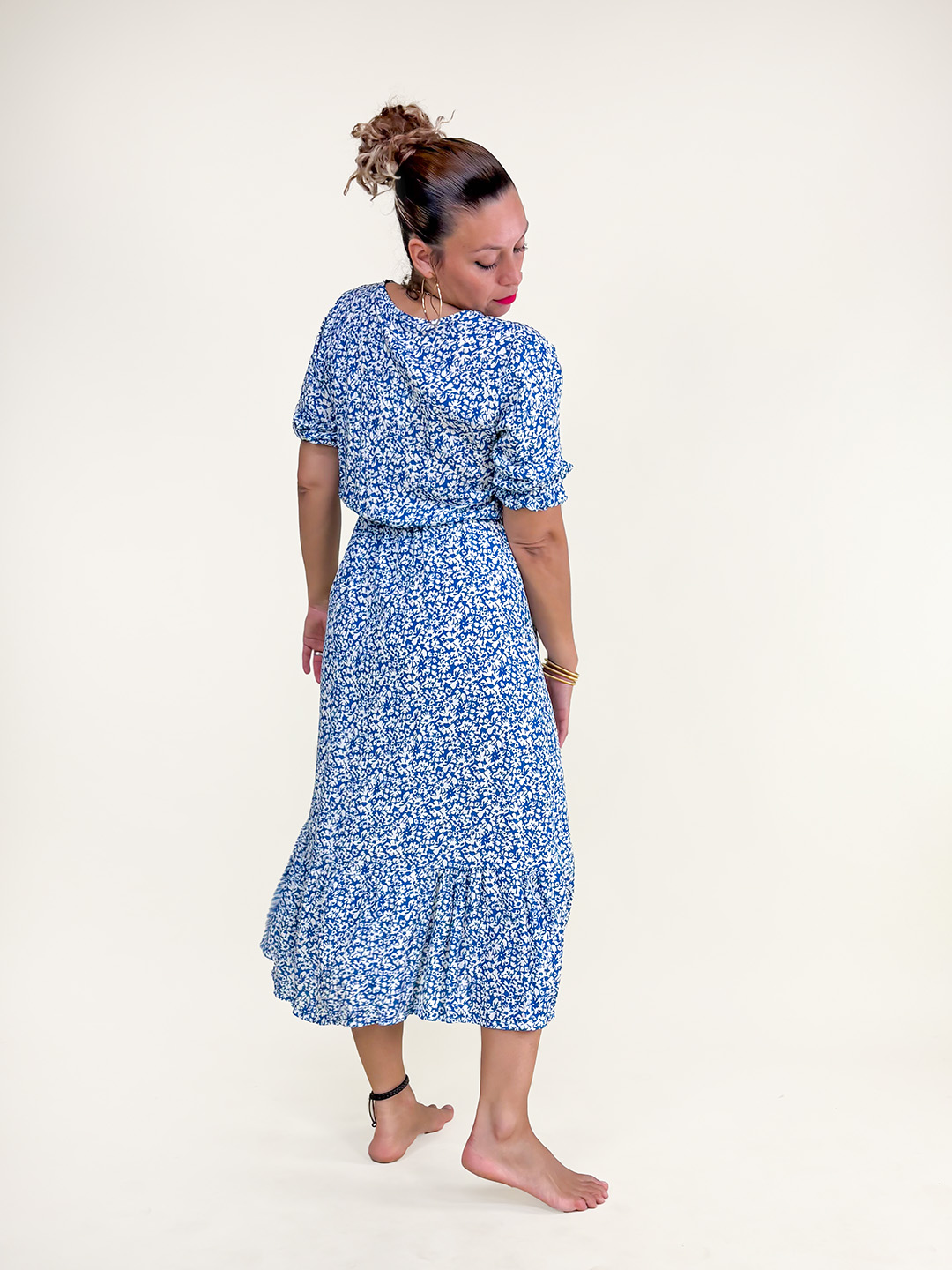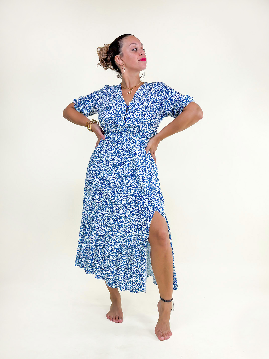 Robe longue à imprimé Fleurs 100% Viscose, col V avec boutons avec attache élastique, taille ajuster élastiquée, manche courte.