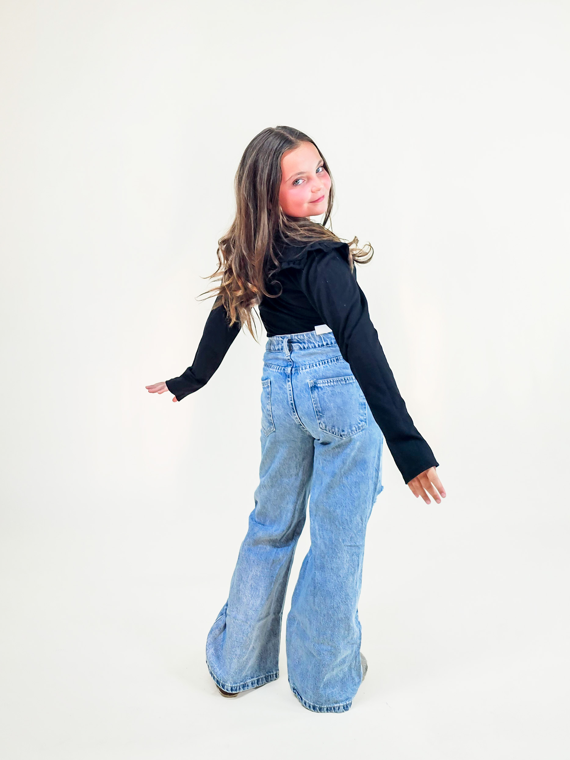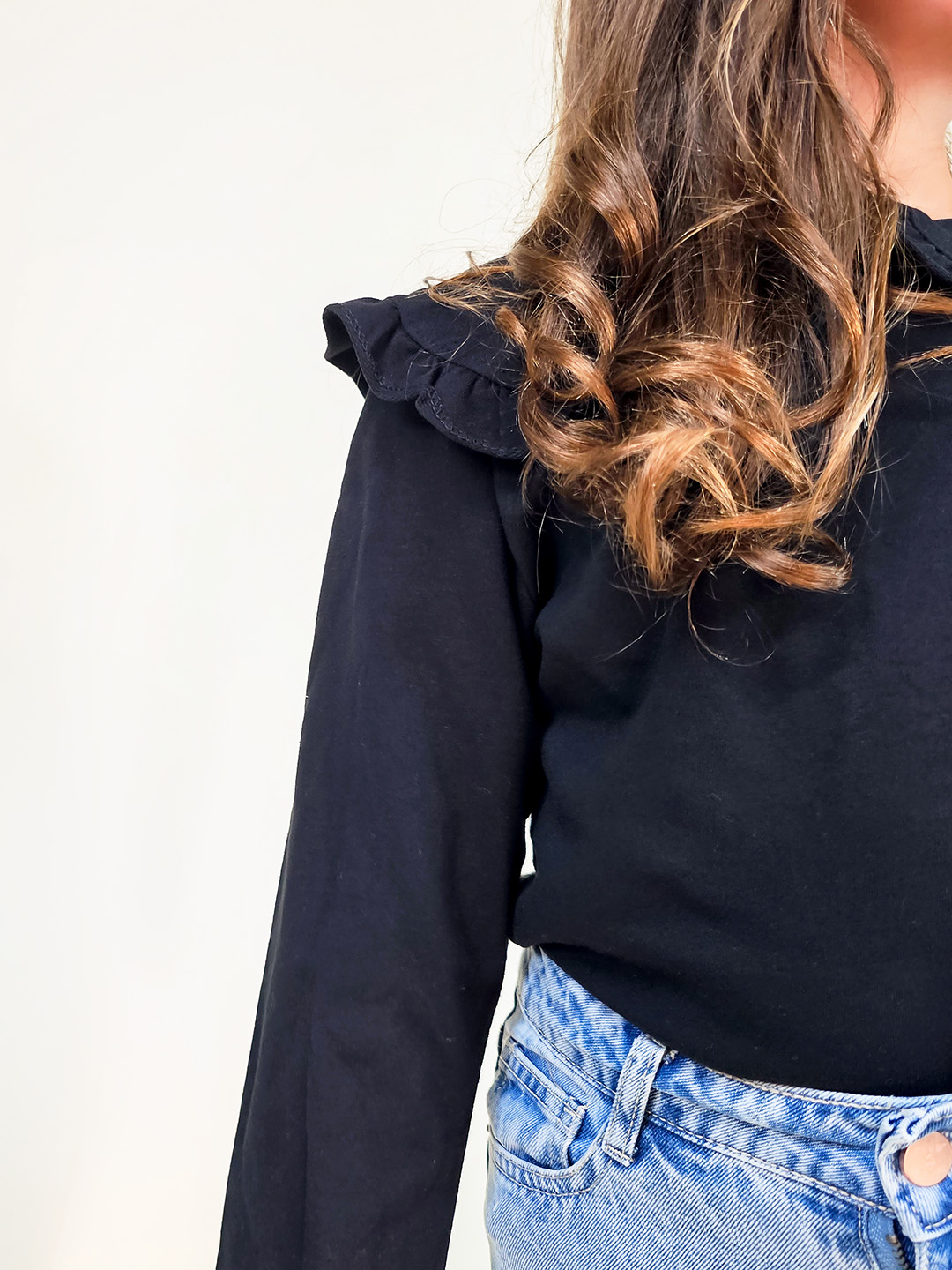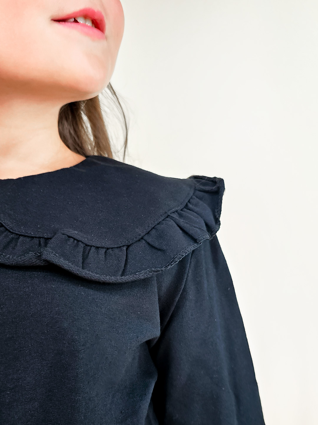 Tshirt manche longue Coton (95%), Élasthanne (5%) grand col Claudine volanté, Finition côtelée aux poignets et à la base.